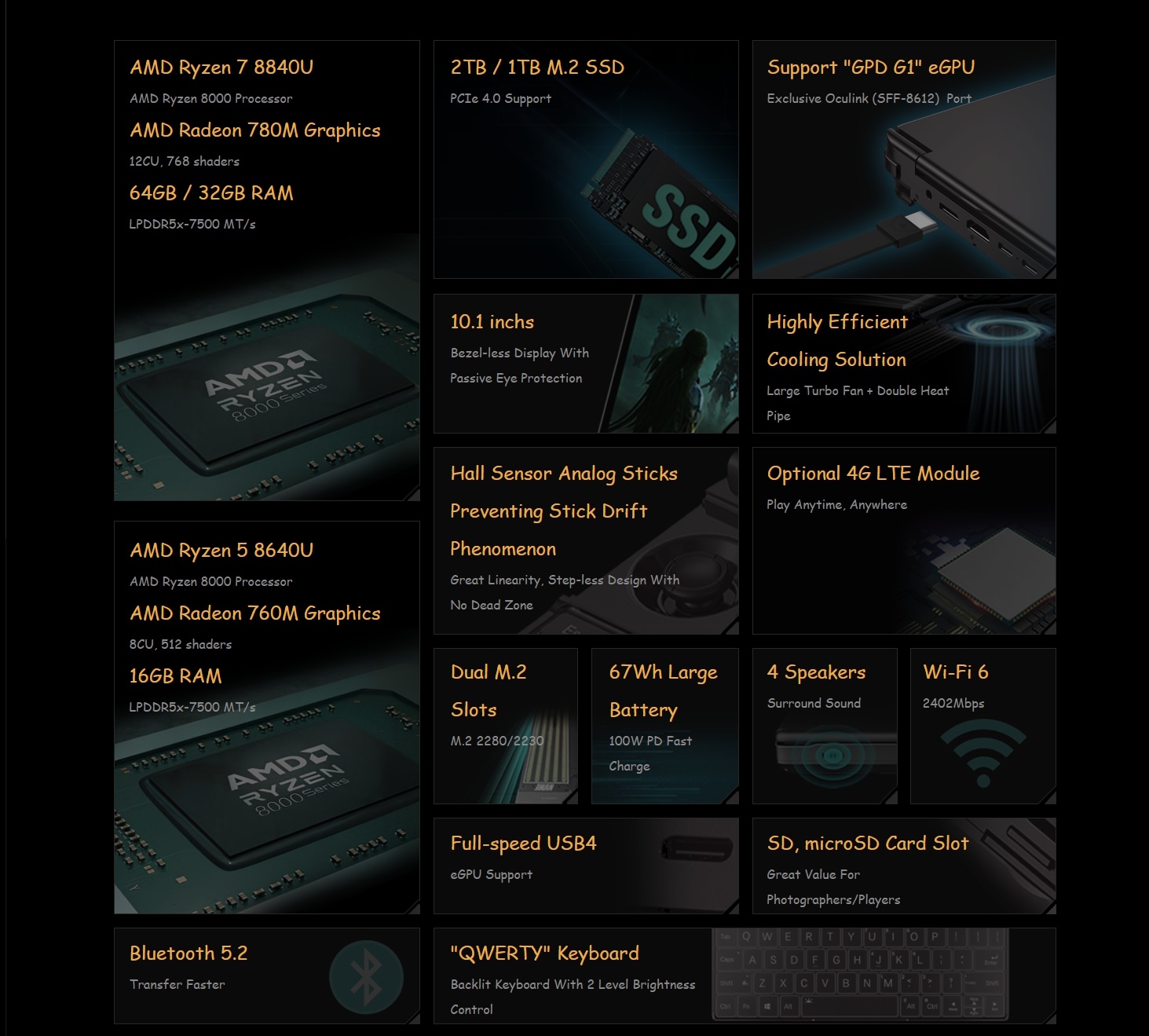또한, 본체에는 USB4, USB 3.2 Gen 1 Type-C, USB 3.2 Gen 1 Type-A×2, HDMI 2.1, OCulink, 3.5mm 미니핀 헤드셋 단자, SD 카드 슬롯, microSD 카드 슬롯을 갖추고 있습니다.