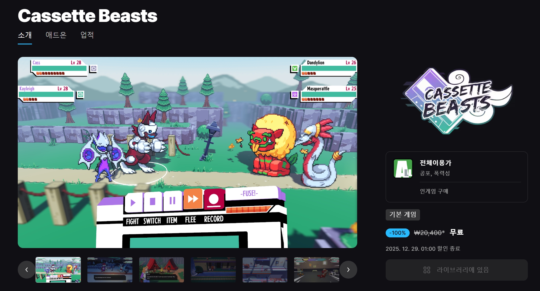 에픽게임즈 스토어 페이지에서는 연말 무료게임 제공으로 매일 새로운 게임들을 한 개씩 제공할 예정이며, 12월 28일 제공되는 여덟번째 무료 게임인 Cassette Beasts는 12월 28일 (AM 1시)부터 12월 29일 (AM 1시) 까지 24시간동안 무료로 제공이 됩니다.