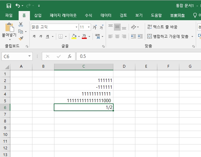 - 분수를 입력하면 날짜로 인식되기 때문에 0을 입력하고 한칸 띄운후 1/2로 표기하면 정상적으로 분수로 처리된다.