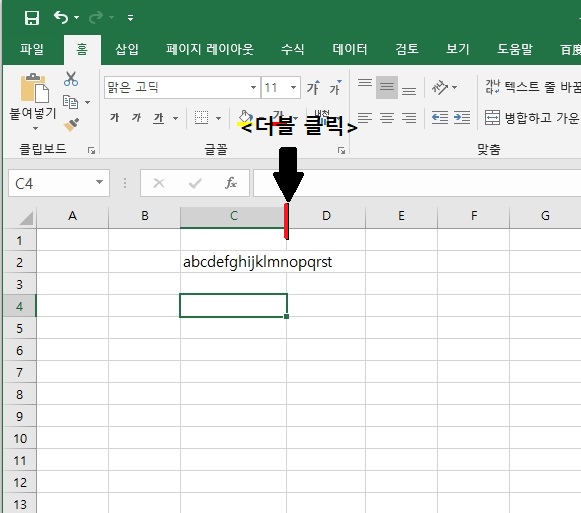 - 입력한 문자의 길이가 셀 너비(1칸)보다 길면 오른쪽 빈 셀을 넘어서 화면에 표시된다. 이때 현재 입력했던 셀의 오른쪽에 데이터가 들어가 있으면, 데이터의 값은 셀의 너비만큼만 표기 된다. 그러므로 데이터 전체를 확인 하고자 한다면, 열 너비를 조절하자. 열 너비를 조절할 때는 마우스를 이용해 수동으로 조절할 수 있지만 대표되는 열 (맨 상단의 A,B,C,D,E.... 로 표기된 부분)을 더블 클릭하면 가장 큰 데이터 길이에 맞게 자동 조절된다.