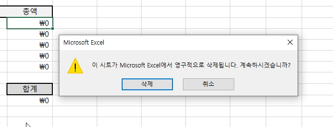 삭제된 시트는 복구가 불가능 하므로 삭제 전 미리 저장하는 것을 잊지 말도록 하자.