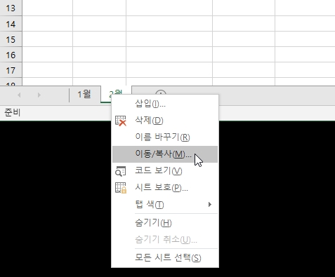 현재 사용중인 시트를 원하는 대로 선택해 새 통합 문서에 복사 할 수도 있다. 현재 작성 중인 여러개의 시트 중 새 통합문서로 옮기고자 하는 시트들을 선택하고 마우스 오른쪽 버튼을 눌러 "이동/복사" 메뉴를 선택한다.