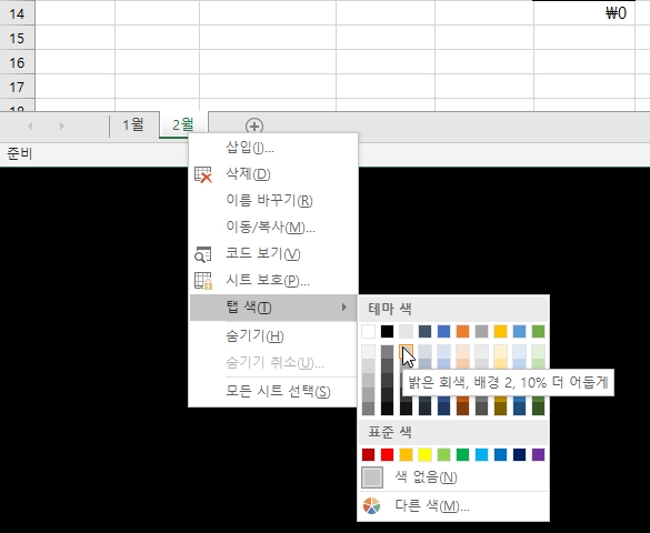 크게 중요한 내용은 아니지만 시트마다 색상을 변경할 수 있다. 특별한 내용을 담은 시트를 구분하기에는 좋은 기능이며, 색상을 변경하고자 하는 시트를 선택해 마우스 오른쪽 버튼을 클릭하고 "탭 색"메뉴를 선택한 후 원하는 색상을 선택해 변경하면 된다.