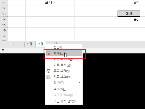 시트를 선택하고 마우스 오른쪽 버튼을 눌러 "삭제"메뉴를 선택하면 해당 시트는 삭제가 된다. Shift키나 Ctrl키를 눌러 여러개의 시트를 선택한 후 한번에 삭제할 수도 있다. (키보드 "Del"키를 눌러도 삭제가 되지 않으니 참고.)