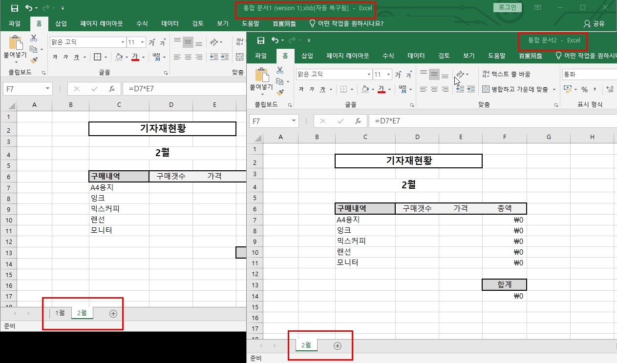 이때, 여러 개의 시트를 선택해 내부적으로 동일한 내용의 셀을 동시에 변경할 수 있는 방법이 있다.