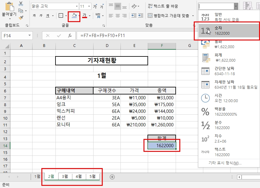 예를 들어 아래 사진에 보이는 2월~5월까지의 합계의 내용을 원화가 아닌 일반 숫자로 기입하면서 색상을 변경하고자 할 때, 합계에 표기된 셀을 선택해 표시형식을 숫자로 바꾸고 셀의 색상을 바꾸면 현재 선택된 2월~5월 까지의 시트 내용이 변경된 걸 알 수 있다.