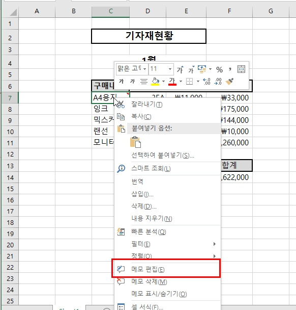 메모 내용이 작성된 셀들 중에 (우 상단에 빨간색 삼각형이 있으면 메모가 삽입된 셀이다.) 수정하고자 하는 셀을 선택하고 마우스 오른쪽 버튼을 누르면 '메모 편집'이라는 메뉴를 확인할 수 있다.