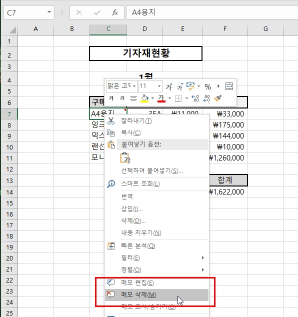 메모 내용이 작성된 셀들 중에 삭제하고자 하는 셀을 선택하고 마우스 오른쪽 버튼을 누르면 '메모 삭제'이라는 메뉴를 확인할 수 있다.
