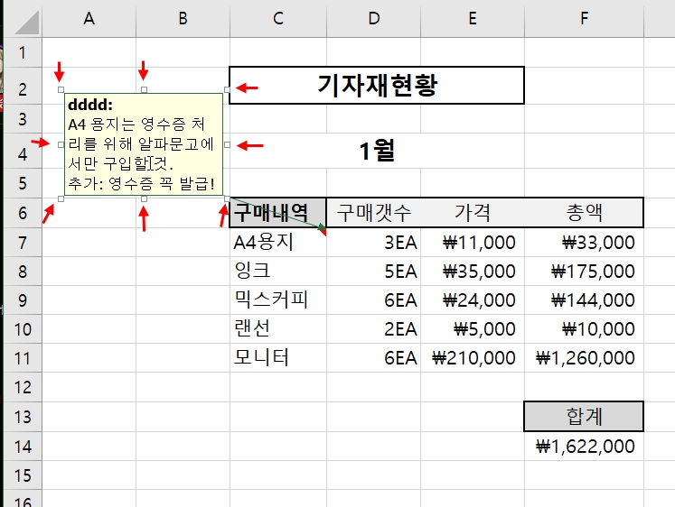 나타난 메모 위에 마우스 커서를 올리면 메모의 사각형 범위 8군데에 크기를 조절할 수 있는 작은 네모들이 보이게 된다. 이 작은 네모 위에 마우스를 올리고 마우스를 클릭한 상태에서 드래그하면 메모의 크기를 조절할 수 있다.