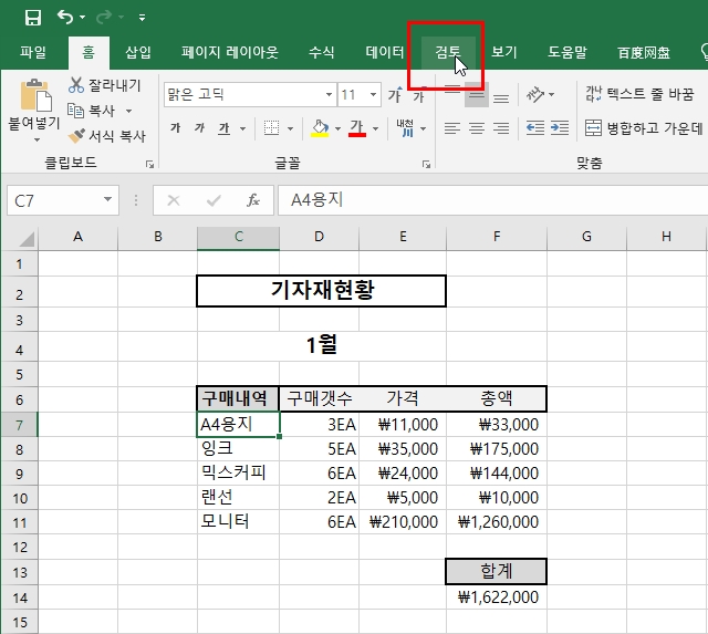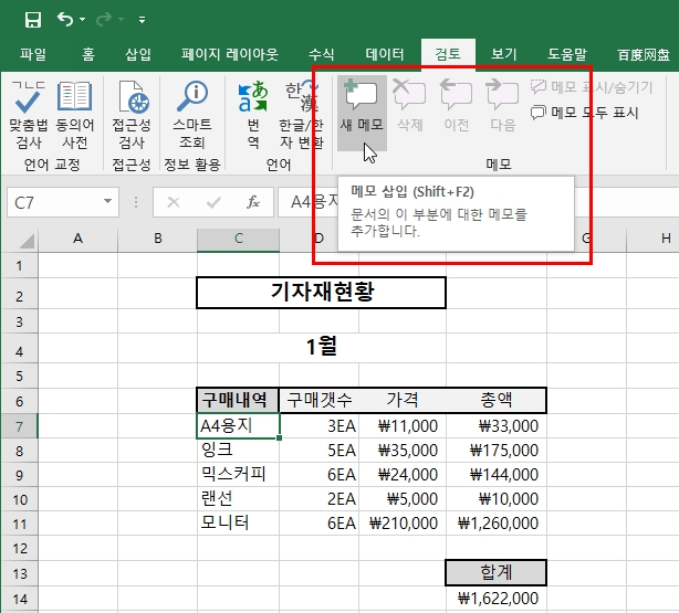메모를 넣고자 하는 셀을 선택한 후 엑셀 툴의 최상단의 메뉴 중 "검토"탭을 선택하고 새 메모를 선택한다. 그러면 선택한 셀 위에 노란색의 '포스트잇' 같은 메모장이 생성될 것이다.