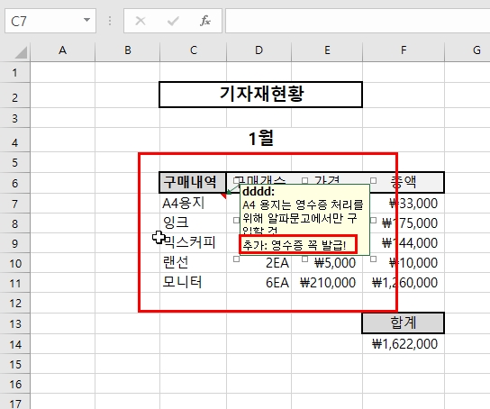 특별히 엑셀의 데이터를 조작하거나 함수를 사용한다거나 하는 고급기능은 아니고 단순히 기록이나 설명을 위해 사용하는 부가 기능이기 때문에 엑셀 기능 중에서는 중요도가 낮은 편이지만 여러 사람이 하나의 엑셀 문서를 통해 협업할 때 현재 사용하고 있는 많은 셀 데이터에 대한 설명을 남기기에는 좋은 기능이니 알아두는 것도 좋을 것이다.