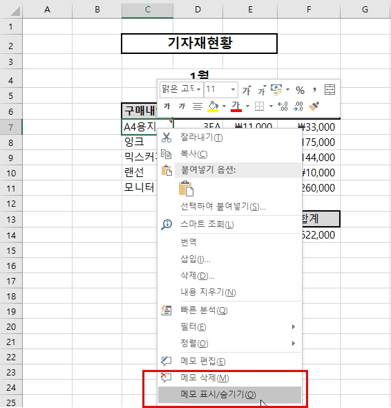 메모를 항상 표시하도록 '메모 표시/숨기기'를 선택하자.