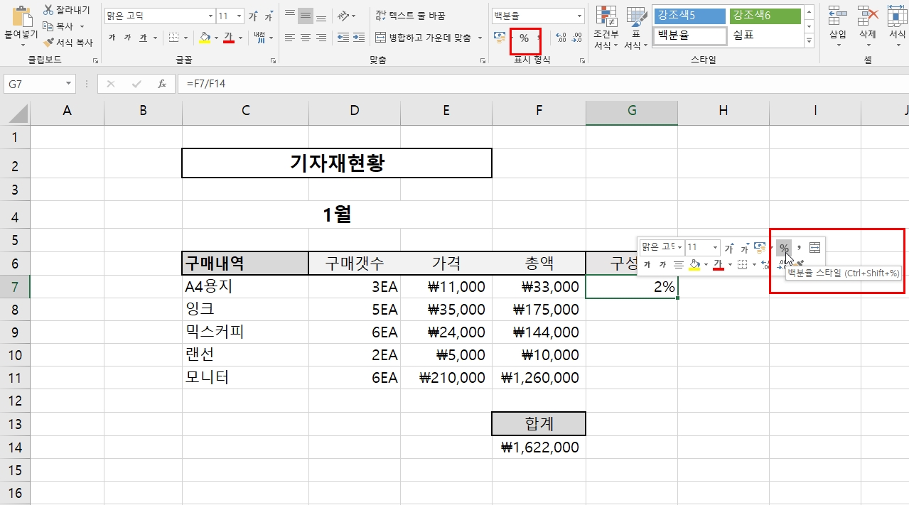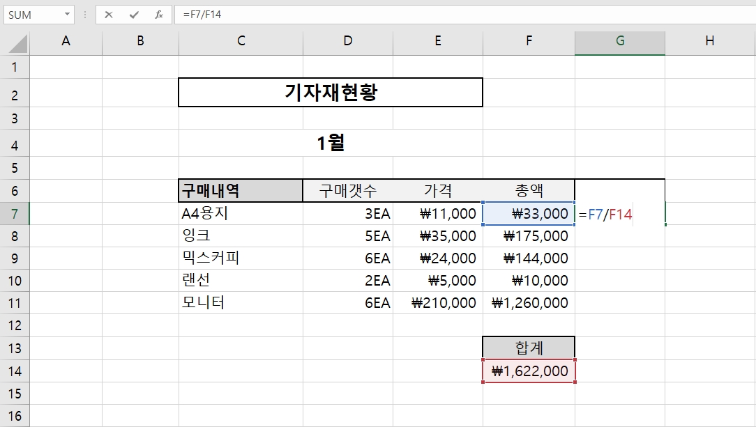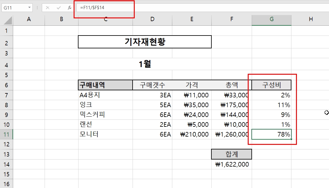 일단 G7번 셀에 구성비를 구한다. 수식은 다음과 같을 것이다. " =F7/F14 "