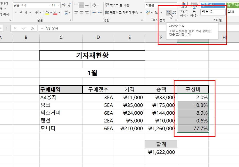 (구성비를 구할 때 백분율을 표기하면서 미리 자릿수 늘림을 하고 자동 채우기를 적용해도 된다.)