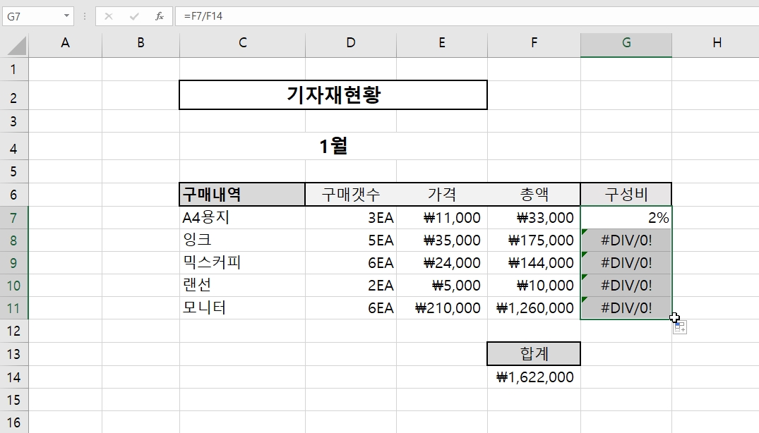 이제 시나리오 2에서 문제가 되었던 #DIV/0! 를 해결해보자. 앞서 설명한 상대 참조 주소 값인 기자재별 총액은 변하는 것이 맞으니 그대로 두고 절대 참조에 해당하는 고정된 주소 값인 분모를 F14셀로 고정하면 제대로 된 구성비가 출력될 것이다.