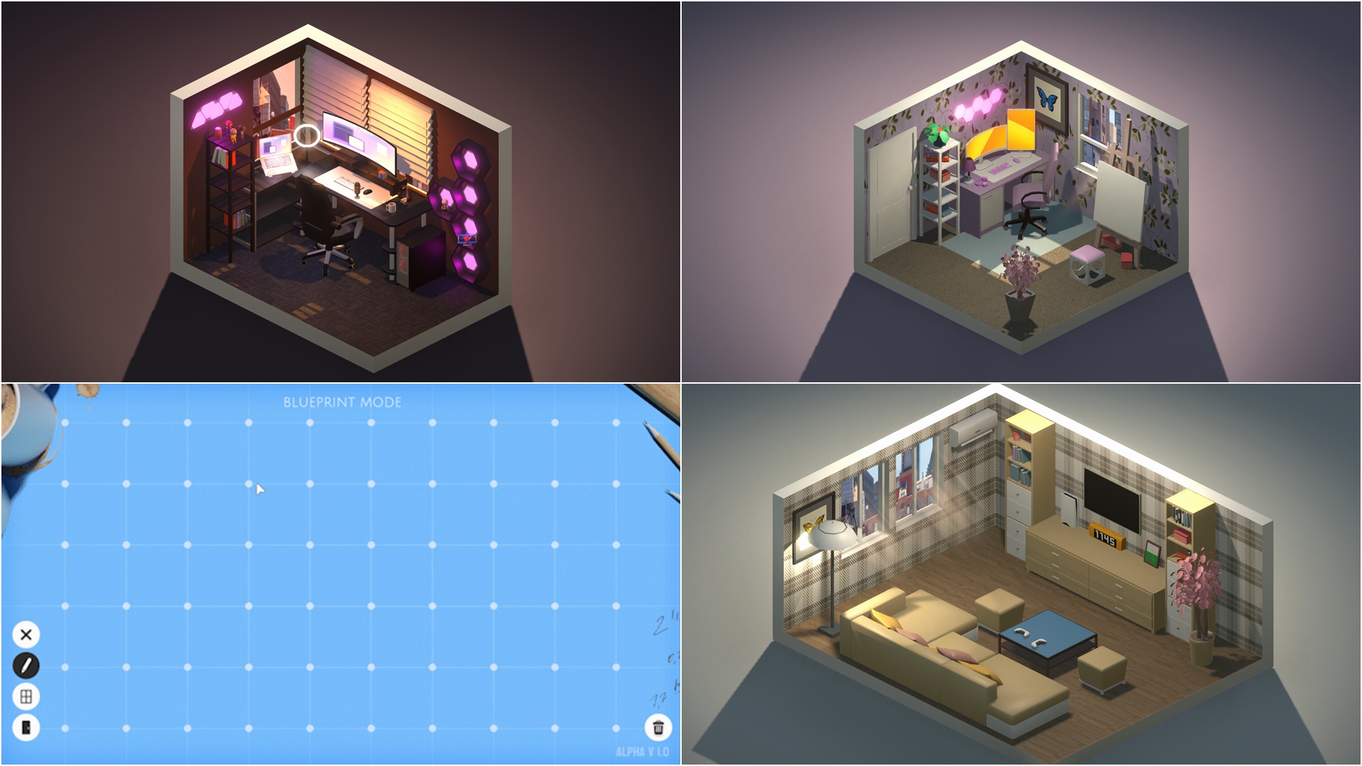 게임을 통해 자신이 이상적인 방을 만들어 볼 수 있는 힐링 시뮬레이션 게임. 게임 내 제공되는 각종 가구를 이용해 방을 만들어 볼 수 있다. 게임용방, 방송용방, 가든을 위한 방이나 공부방 등등 플레이어가 생각하고 꾸며보고 싶은 방을 마음껏 인테리어가 가능. 가구의 배치는 그리드에 영향을 받지 않고 자유롭게 배치할 수 있고, 블루프린트 모드를 이용해 방의 크기도 조절할 수 있다. 컬러 피커를 이용해 색상 변경의 자유도도 높고, 바닥이나 벽의 분위기도 변경할 수 있다. 현재 자신의 방을 바꿔보고 싶다면 본작을 통해 미리 인테리어 해보는 것도 추천.